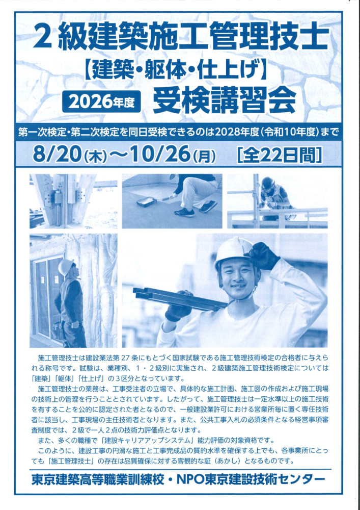 科目:建築学等(6回)、法規(4回)、施工管理(7回)、第二次検定対策(3回)、模擬試験(2回)